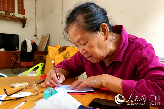 靖西市舊州繡球村“中華巧女”黃肖琴在畫草圖