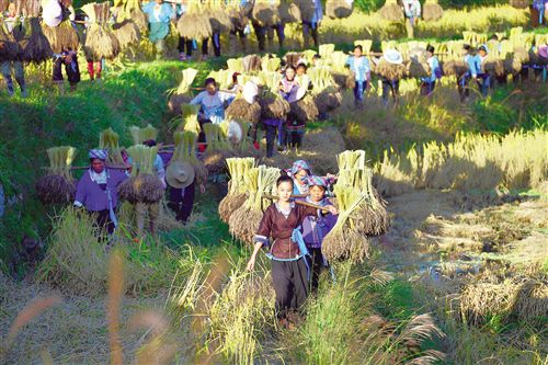 在廣西融水苗族自治縣安太鄉元寶村,村民挑著香糯走在田間(10月30日攝)。 新華社記者黃孝邦 攝