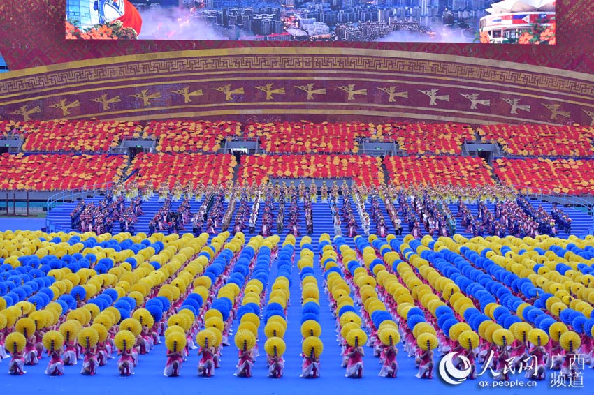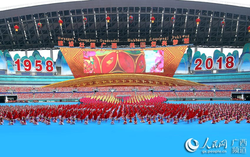 隨後進行了《奮進新時代壯美新廣西》群眾文藝表演。表演以“花海迎賓朋”為序曲,分為“和諧大家園”“壯美新廣西”“奮進新時代”3個篇章。最後,全場高唱《歌唱祖國》,祝福祖國繁榮昌盛、廣西明天更加美好。