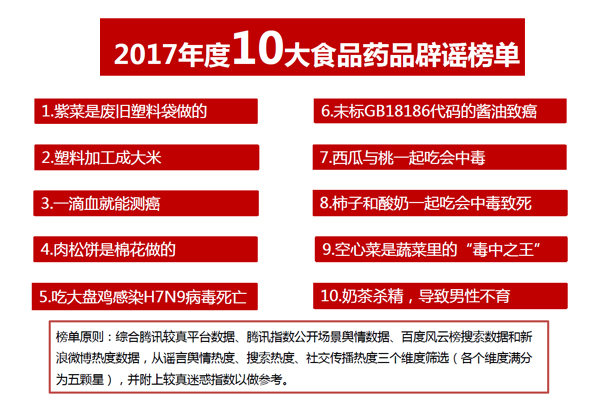 改報告分析了食品藥品謠言易感人群畫像,對謠言傳播特點進行了深入研究,總結出食品藥品謠言六大作惡伎倆,發布了2017年食品藥品十大辟謠榜單。