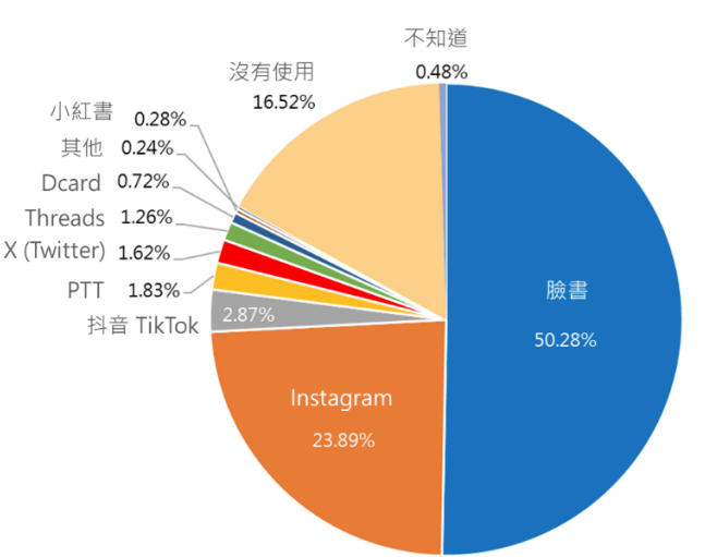 根據隸屬于臺“數位發展部”的臺灣網絡信息中心公布的“2024年度臺灣網絡報告”顯示,島內使用人數最多的社交平臺是臉書,市佔率達50.28%,佔據半壁江山;其次是Instagram、抖音/TikTok、PTT、X、Threads,小紅書只能排在第八名,市佔率只有可憐的0.28%,在報告中簡直小到看不見。