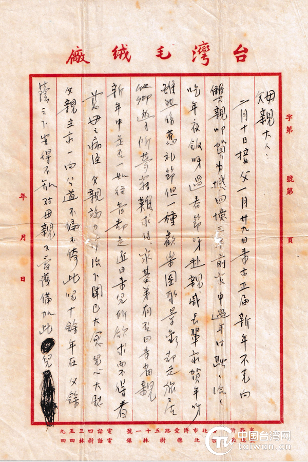 伯父在臺灣工作生活都比較順利,他與祖父一直保持通信,知悉彼此的情況,祖父也一直想去臺灣探望但最終也未成行。伯父去臺灣工作本是當時的權宜之計,以為年底或近年內便可以返回上海。未曾想到伯父這一去,就未能再回來。在寄來的信件中,伯父多次提到自己對雙親和家鄉的想念:“無時無刻不在思念中,奈兩地遙隔,種種不便,致疏于請安,有違人子之道”。這種思念愈來愈強,每逢佳節更是倍思親,1952年新年,伯父來信說: