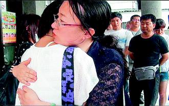 大陸籍領隊葉雲(擁抱者右)昨將團員捐款,交給罹難司機施俊豪的家屬,輕擁施的女兒勸慰:“你要堅強、要照顧媽媽。”後面的團員都紅了眼眶。圖片來源:臺灣《聯合報》