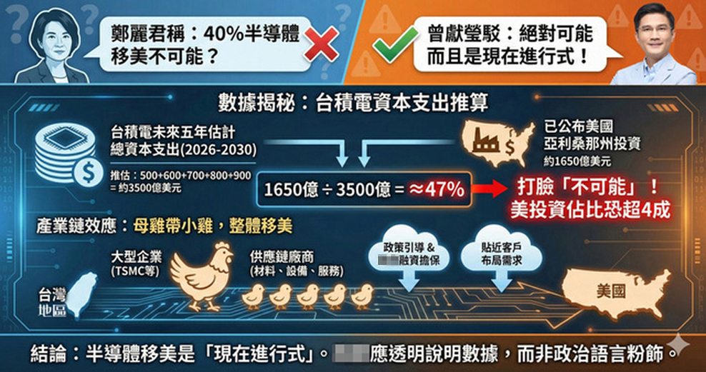 曾獻瑩指出,這直接打臉鄭麗君所說的“不可能”!臺灣40%先進半導體產能移美絕對可能,而且是現在進行式!他表示,日前公布的臺灣地區對美關稅談判內容中,涉及約5000億對美投資,其中約2500億由企業自行出資,另外約2500億由臺當局提供融資與信用擔保。上述情況勢必導致半導體產業出現“母雞帶小雞”(出走)效應,臺灣未來5年整體產業鏈勢必將移向美國。