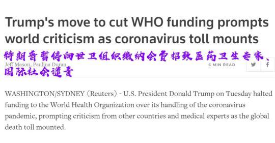 路透社報道稱,隨著全球因疫情死亡人數攀升,特朗普暫停向世衛組織繳納會費舉動遭到醫藥衛生專家和國際社會的普遍譴責。