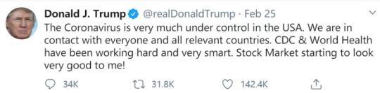 (特朗普2月25日帖文譯文:新冠肺炎疫情在美國控制的非常好。我們和其他相關國家和國際組織一直在保持交流。美國疾控中心和世衛組織都在努力工作,他們非常聰明。股票市場看起來也非常不錯!)
