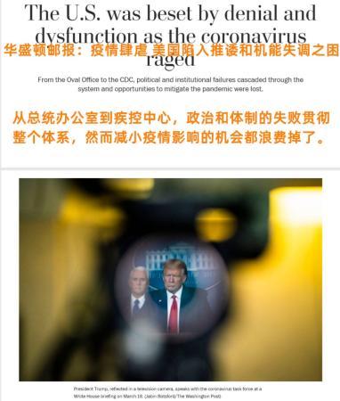《華盛頓郵報》近日撰文《疫情肆虐 美國陷入推諉和機能失調之困》,文章指出,特朗普政府早在1月3日就接到中國暴發新冠疫情的正式通知。數天內,美國情報機構不斷提示特朗普疫情的嚴重性,其中一條警告就出現在總統每日簡訊里。
