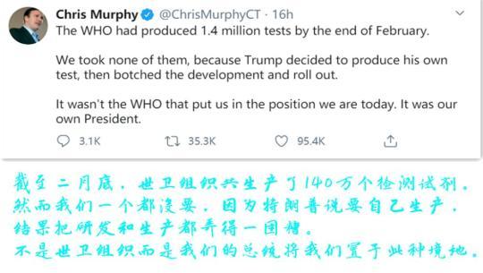 墨菲說,美國陷入危機不是因為中國做了什麼,也不是因為世衛組織做了什麼,而是因為特朗普總統的所作所為。