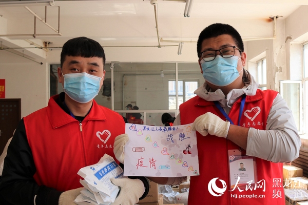 4月15日10點,張鴻博的“同事”——綏芬河市的青年志願者劉曉亮(右)和趙世濤(左)打開一箱未寫有寄件人的援助物資,驚喜地發現一張手繪畫,上面寫著“戰勝疫情,黑龍江人是最棒的!”