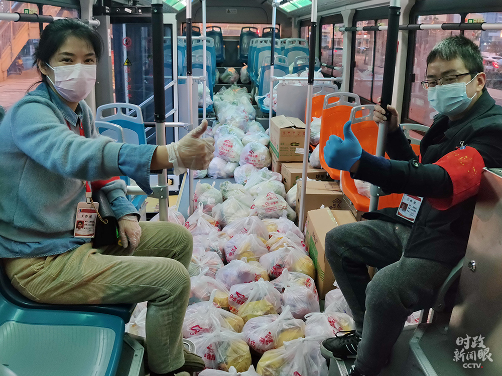 △今年2月24日,武漢某社區網格員和志願者分袋裝好食品套餐,通過公交車運送到居民手里。