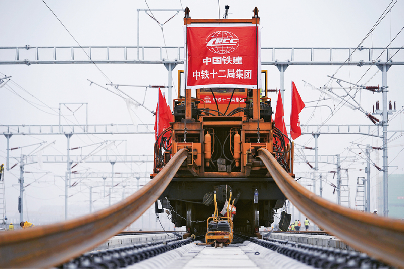 2020年8月17日,京雄城際鐵路全線軌道貫通。圖為工人駕駛鋪軌車安裝最後一段鋼軌。 新華社記者 邢廣利/攝