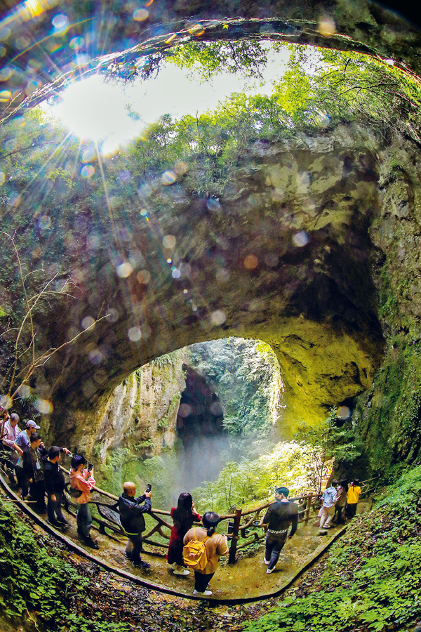 黨的十八大以來,我國生態文明建設取得歷史性成就,人民群眾生態環境獲得感、幸福感和安全感不斷增強。圖為2020年9月24日,遊客在湖南省湘西世界地質公園靈洞天坑里觀光遊覽。 人民視覺供圖 曾祥輝/攝