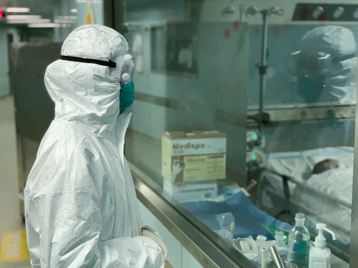 2月26日淩晨,人民日報記者吳姍在武漢市金銀潭醫院ICU重症病區採訪。