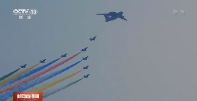 畫面中,隨著彩煙梯隊的10架教-8型教練機以嚴整的隊形飛過,天安門上空留下了一條以紅、黃、藍為主的彩色煙帶。