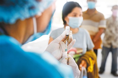 6月1日,一名醫務人員在柬埔寨金邊為民眾接種中國研制的新冠疫苗。