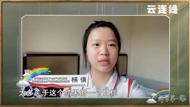 《開學第一課》中,主持人康輝在雲連線楊倩時,問她是否在賽前就有奪冠的自信,楊倩只是淡淡地說:“在賽前的時候,並沒有給自己設立太多關于結果的目標,更多的還是想去做好這個過程,在建黨一百周年,能夠代表國家出徵,也是我的榮譽和一個責任。”