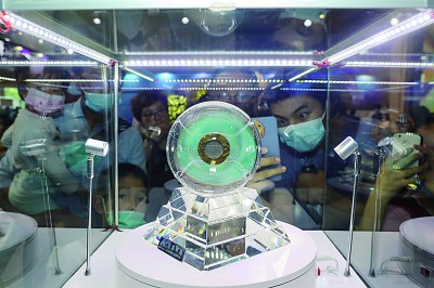 2020年12月17日,嫦娥五號返回器攜帶月球樣品在內蒙古四子王旗預定區域安全著陸,成功實現了月球表面採樣返回。圖為2021年5月15日,江蘇無錫博物院,觀眾在深空深海重大科技成果展上觀看展出的月壤。新華社發