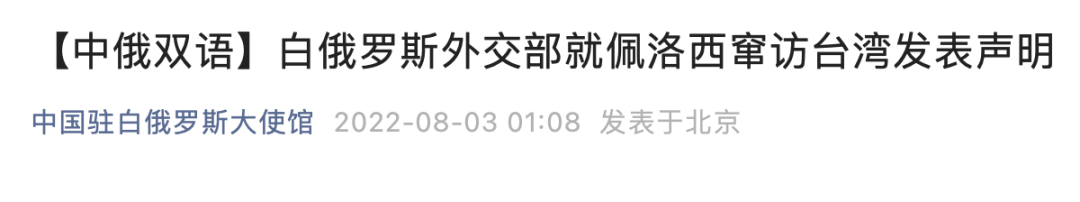 8月2日,白俄羅斯外交部就佩洛西竄訪臺灣發表聲明,全文如下: