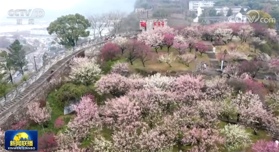 浙江臨海的這片梅園背靠古城牆,數十種梅花依著山勢次第盛開,吸引市民和遊客前來踏青。高雅的梅花與古樸的城牆相映成趣,人們在遊覽中領略自然之美、歷史之美。