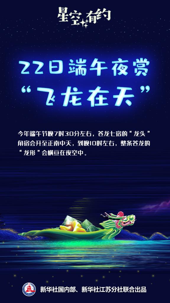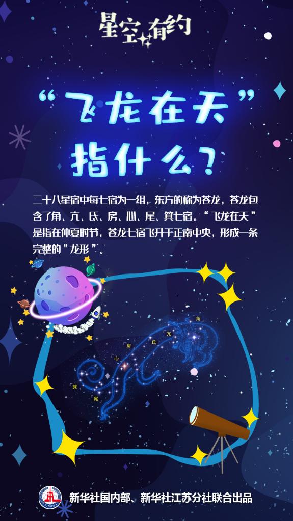 新華社南京6月20日電(記者王玨玢、朱筱)中科院天文科普專家介紹,22日端午節晚7時30分左右,蒼龍七宿的“龍頭”角宿會升至正南中天,到晚10時左右,整條蒼龍的“龍形”會橫亙在夜空中,公眾可以觀賞到“飛龍在天”天象。這條遨遊在天上的“飛龍”是什麼?“飛龍”是如何飛上天的?