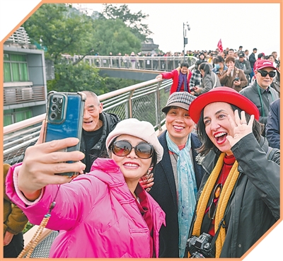 外國遊客在重慶半山崖線鵝嶺棧橋與市民合影。新華社記者 陳 誠攝