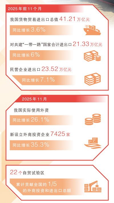 2025年,面對復雜嚴峻的外部環境,中國外貿逆勢而上,實現量穩質升,以穩健的增長展現充沛的活力。2025年前11個月,我國貨物貿易進出口總值41.21萬億元,同比增長3.6%。
