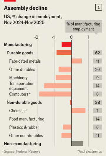 《經濟學人》網站報道指出,數據顯示,美國制造業收縮已進入第三年,截至2025年11月的工廠年度就業率下降了 0.6% 。這並非外部因素的孤立影響,而是關稅政策直接導致的負面效應。