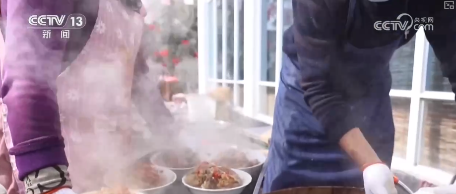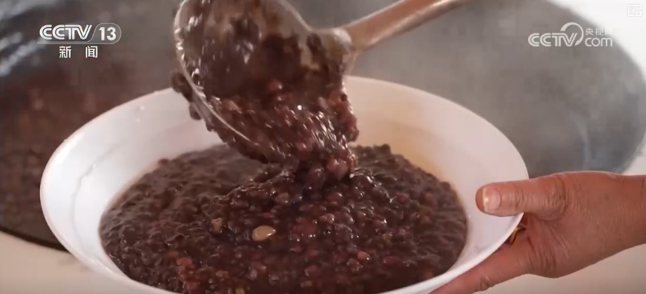 經過2個多小時的慢火熬煮,熱氣騰騰的臘八粥香漫街巷,當地村民和外地遊客都可免費領取。
