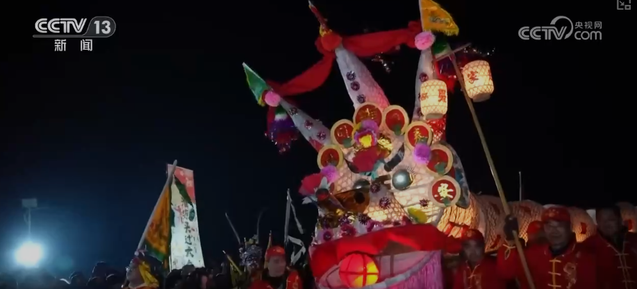 隨著天色漸晚,村里最隆重的慶祝活動東泉馬燈、張家龍燈伴隨著鑼鼓聲,依次登場。張家龍燈已有500年的歷史,現場近百人組成的龍燈團隊聲勢浩大。
