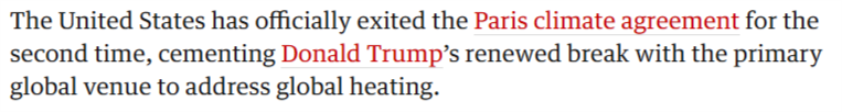 當地時間1月27日,美國退出《巴黎協定》正式生效。 這已經是美國政府第二次退出該協定。對此,英國《衛報》近日刊文稱,這標志著特朗普再度背棄全球氣候治理體係。