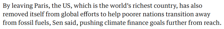 文章警告稱,隨著美國退出《巴黎協定》,由美國總統推動的化石燃料擴張所導致的任何排放增長,都將在全球范圍內產生影響。同時作為全球最富裕的國家,美國此舉也使其自身從全球幫助貧窮國家擺脫化石燃料的努力中脫離出來,讓氣候融資目標變得更加遙不可及。文章援引業內人士的話說:“對于那些嚴重依賴化石燃料生產和出口的低收入國家而言,這將使它們的轉型變得更加困難,因為美國表示不會資助任何相關工作。”