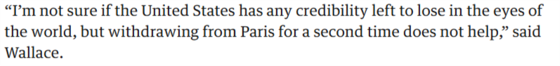文章最後指出,美國此舉也進一步強化了其作為全球政策不可靠夥伴的印象。文章引用約翰斯·霍普金斯大學中國研究教授傑里米·華萊士的話說,“我不確定美國在世界眼中是否還有任何信譽可言,但第二次退出《巴黎協定》絕不會(對提升信譽)有所幫助。”