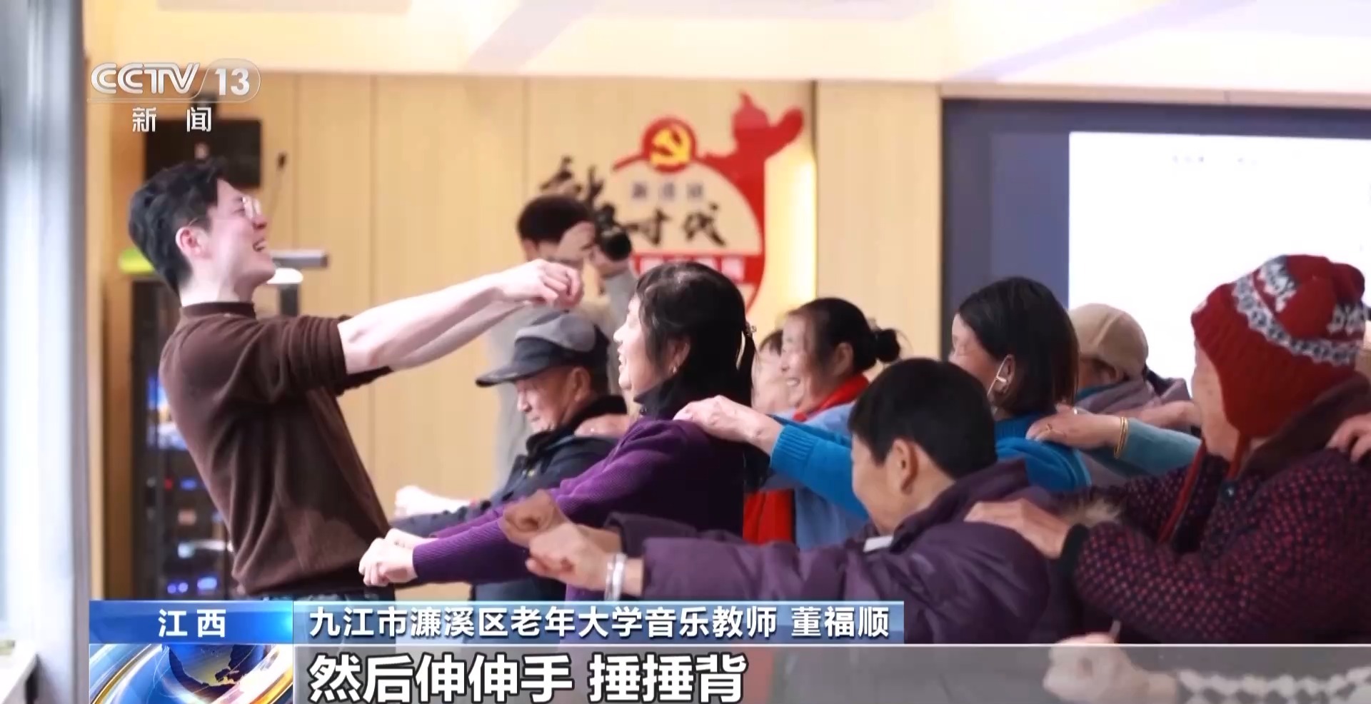 九江市濂溪區老年大學音樂教師 董福順:我覺得音樂它是有律動的,結合那個律動再加這些動作,然後伸伸手、捶捶背,我覺得這不就是生活中的動作,你把它再帶到課堂里邊兒,帶到音樂里邊兒,課堂就不一樣。