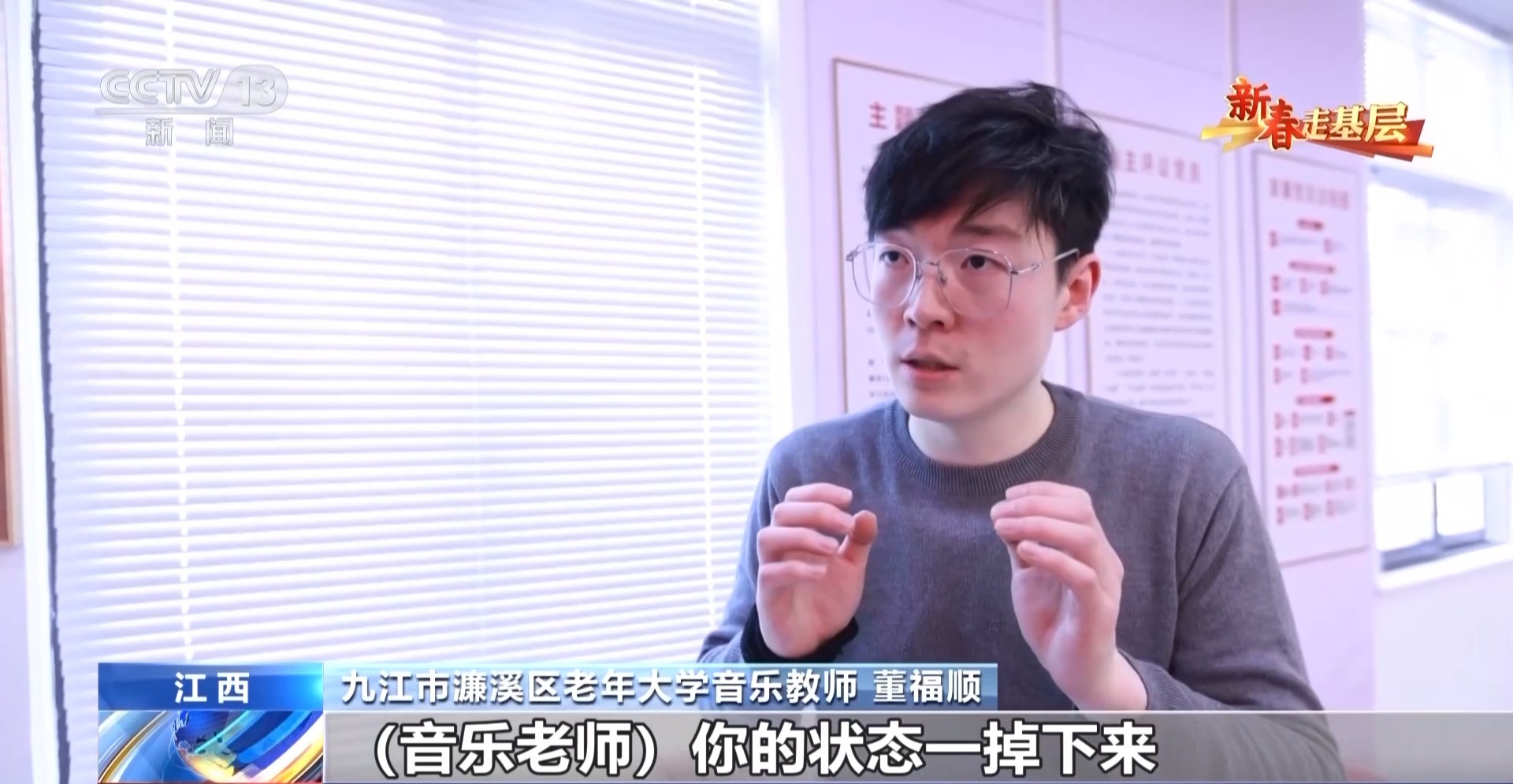 九江市濂溪區老年大學音樂教師 董福順:音樂老師的狀態一掉下來,老年人他就困了,10分鐘就困。但是如果我要用我的這種感情,不停地去帶,你會發現他們會越來越開心。我想要的就是這種效果,你一定要100%、200%甚至300%的這種熱情帶動,他們可能才有40%到60%、60%到80%的這種回饋。