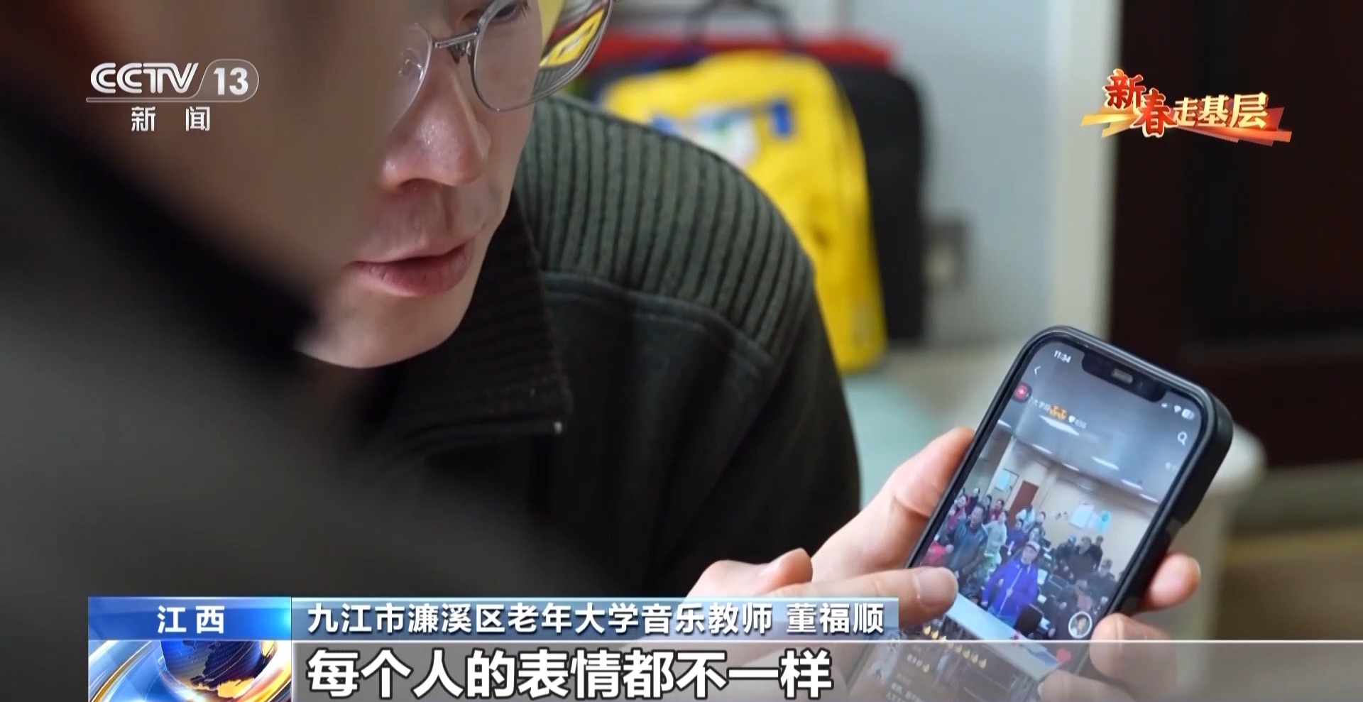 九江市濂溪區老年大學音樂教師 董福順:這些叔叔阿姨們很可愛,每個人的表情都不一樣,然後還有搗亂的,別人都在認真做作業他要去摸別人一下。最初發這個視頻,就是想讓老年人回到家里跟著練。然後發著發著網友就開始叫“大型認親現場”,然後就開始囑咐,“老師能不能晚點放學,不然又回來念叨”。然後你看,“都挺好,給我爸爸報上”,其實你看都是在關心自己的長輩,我們其實都想去對父母說我愛你,但是中國人很含蓄,所以在這里邊我看到了這一點。