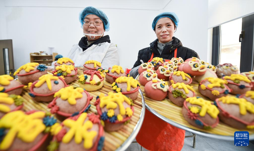 2月4日,在河南省洛陽市西工區紅山街道棗園社區花饃工坊內,工人展示制作好的花饃。