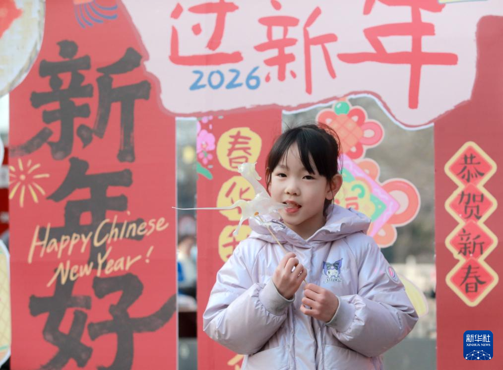 2月4日,在江蘇省揚州市錦旺社區“非遺迎新春”市集活動中,一名小朋友在品嘗糖人。