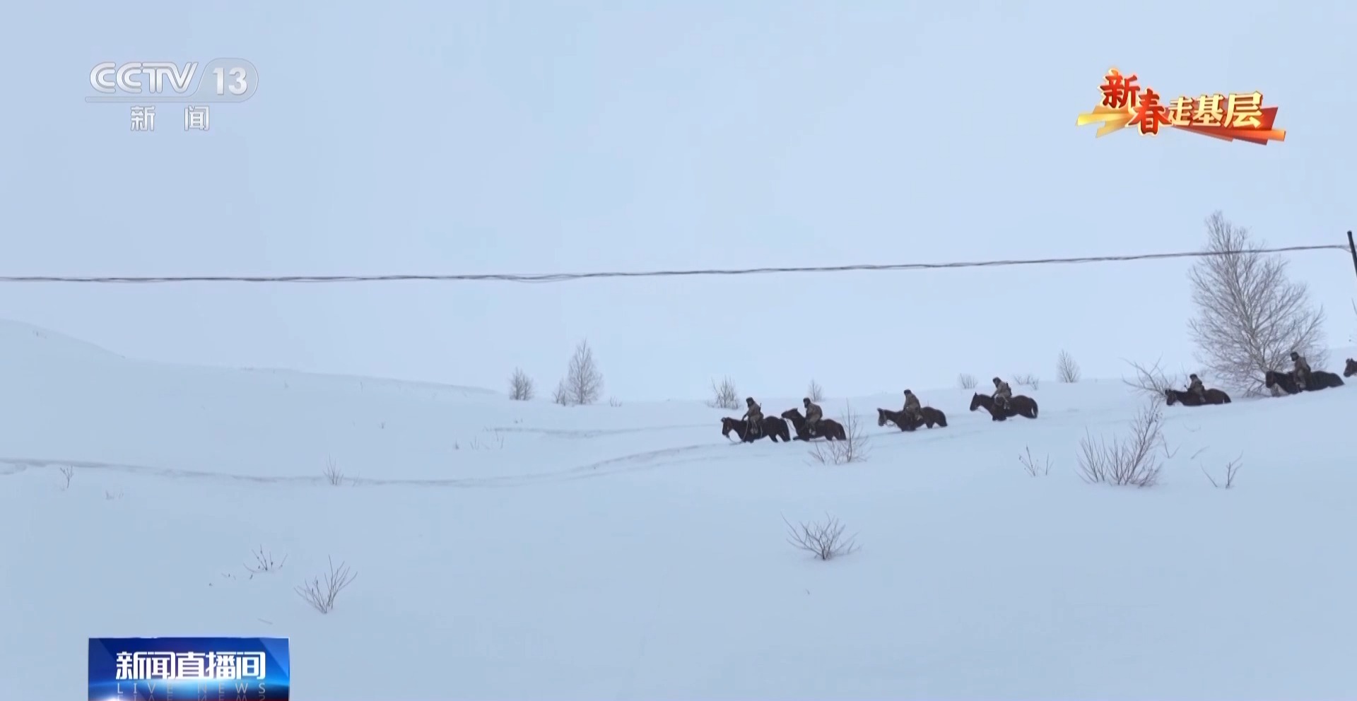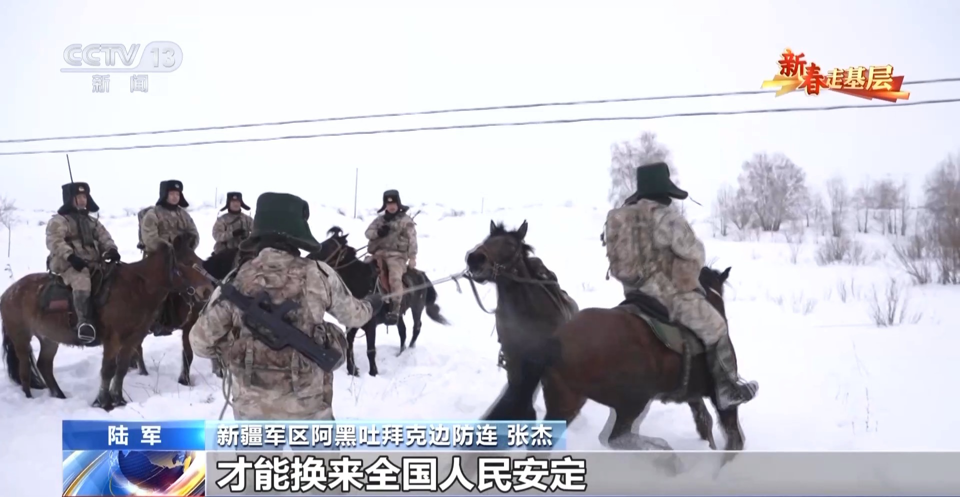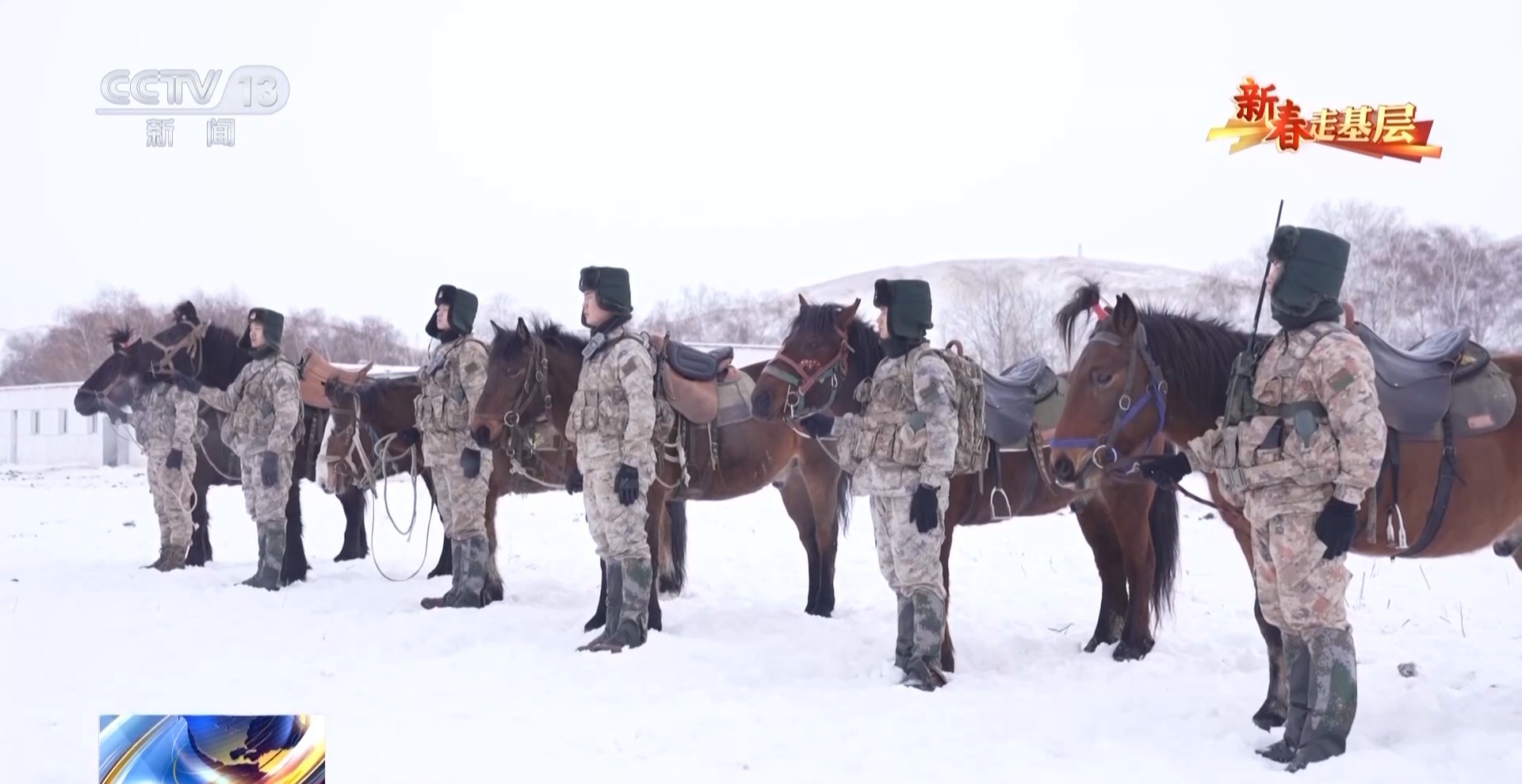 總臺央視記者劉潔:官兵們正在進行騎馬巡邏的準備,每匹軍馬都係上了鮮艷的紅頭繩,給冬日的邊關帶來了暖暖的年味。這些軍馬是官兵們巡邏途中最親密的戰友,今天他們再一次踏上邊防巡邏路,用堅守迎接新春。