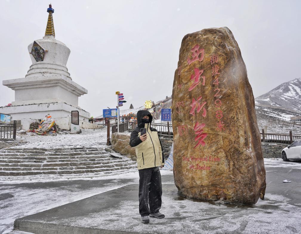 1月30日,遊客正在折多山埡口處“西出折多”碑前打卡拍照。新華社記者劉坤 攝
