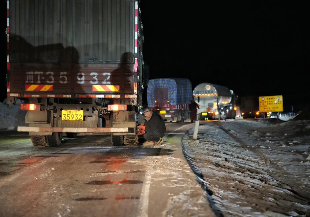 1月30日晚,折多山雪夜中,司機們紛紛停車安裝防滑鏈。新華社記者劉坤 攝