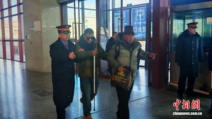 圖為日喀則站客運工作人員幫扶盲人進站候車。拉薩車務段 供圖