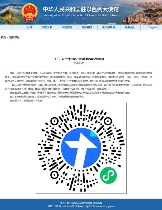 中國駐以色列使館3月1日發布通知稱,建議在以的中國公民(包括港澳臺同胞)在確保安全前提下,盡快轉移至以色列境內安全地區避險。使館自3月1日起開放撤離登記,無法自行安排但有意前往埃及的中國公民(含港澳臺同胞)可注冊登記,需持有效中國護照或港澳臺相關證件(臺胞證、港澳特區護照等)。
