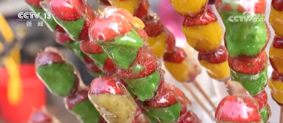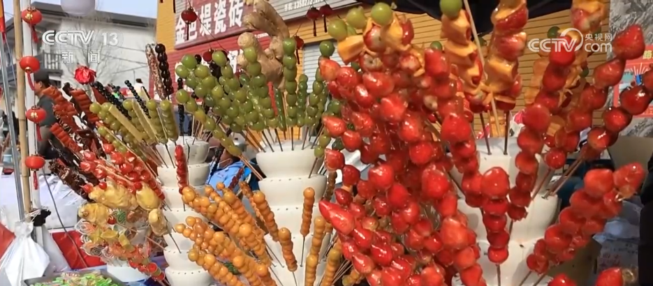臨近元宵節,在河北滄州任丘市呂公堡鎮的“糖墩廟會”上,摩肩接踵、人頭攢動,攤位一個接一個擠滿整條街。除了傳統的山楂、山藥口味,在這里,西紅柿、葡萄、草莓、柚子,甚至柿子椒、辣條也被裹上了亮晶晶的糖外衣。這些新奇的口味,吸引不少遊客買來嘗鮮。