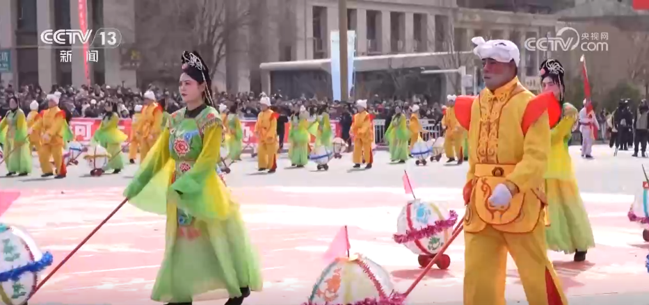 在鑼鼓隊的演奏中,青海海東市的民俗巡遊活動拉開帷幕。由27支表演隊伍、3000多名表演者組成的方陣浩浩蕩蕩走上街頭,高蹺表演一出場,瞬間點燃了現場氣氛。“百龍千獅”隊伍威武雄壯,舞龍飛騰跳躍;雄獅搖頭擺尾,引得觀眾陣陣喝彩。緊隨其後,百人扇子隊、百人花束隊、土族安昭舞等民俗節目也逐一亮相,表演中,演員還會與沿途觀眾熱情互動,讓現場的外國遊客感受到了中國獨特的文化魅力。