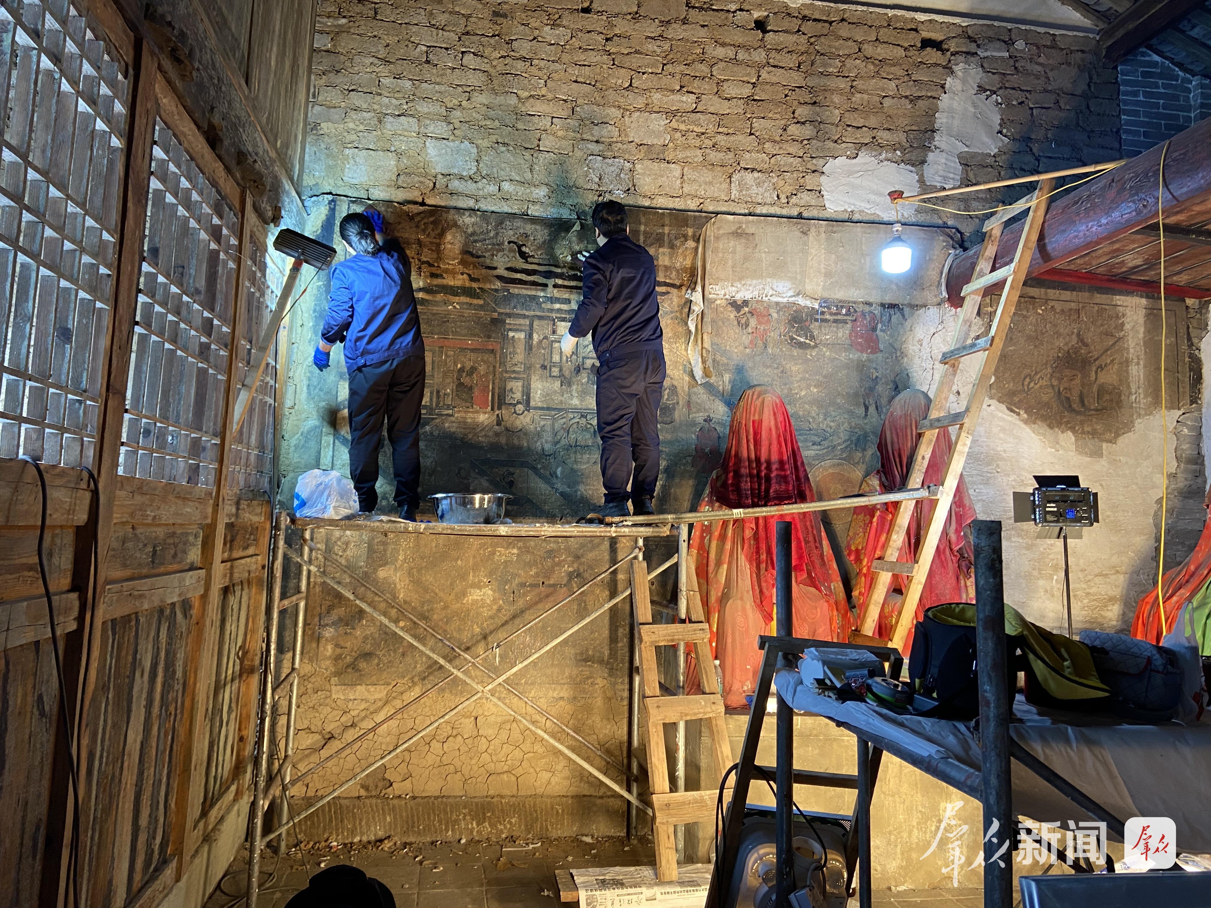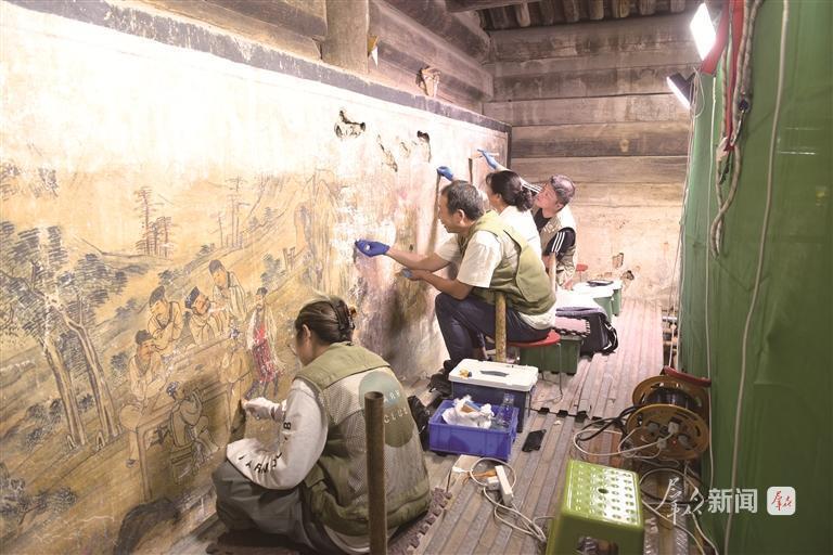 2025年6月,陜西省文物保護研究院(陜西省文物鑒定研究中心)工作人員修復留壩三聖宮壁畫。受訪者供圖
