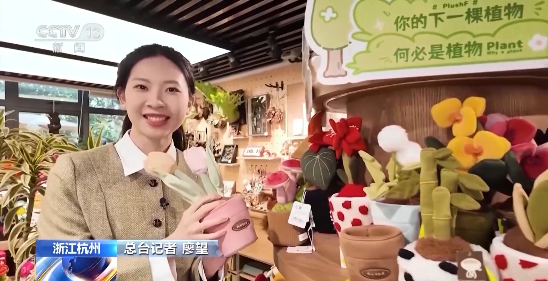 遊客 楊君:這個毛絨玩具是盆景的一個造型,很獨特然後也很可愛,你看它有點張牙舞爪的。
