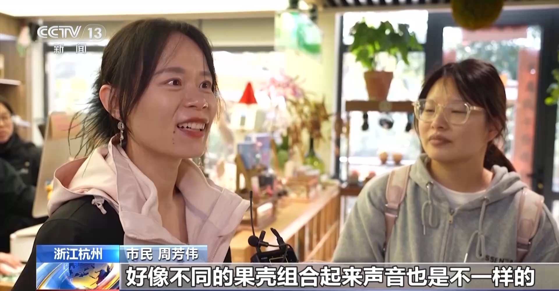 市民 周芳偉:好像不同的果殼組合起來聲音也是不一樣的,有些像溪流。還有比較柔和的聲音,挂在包上還是挺好的。