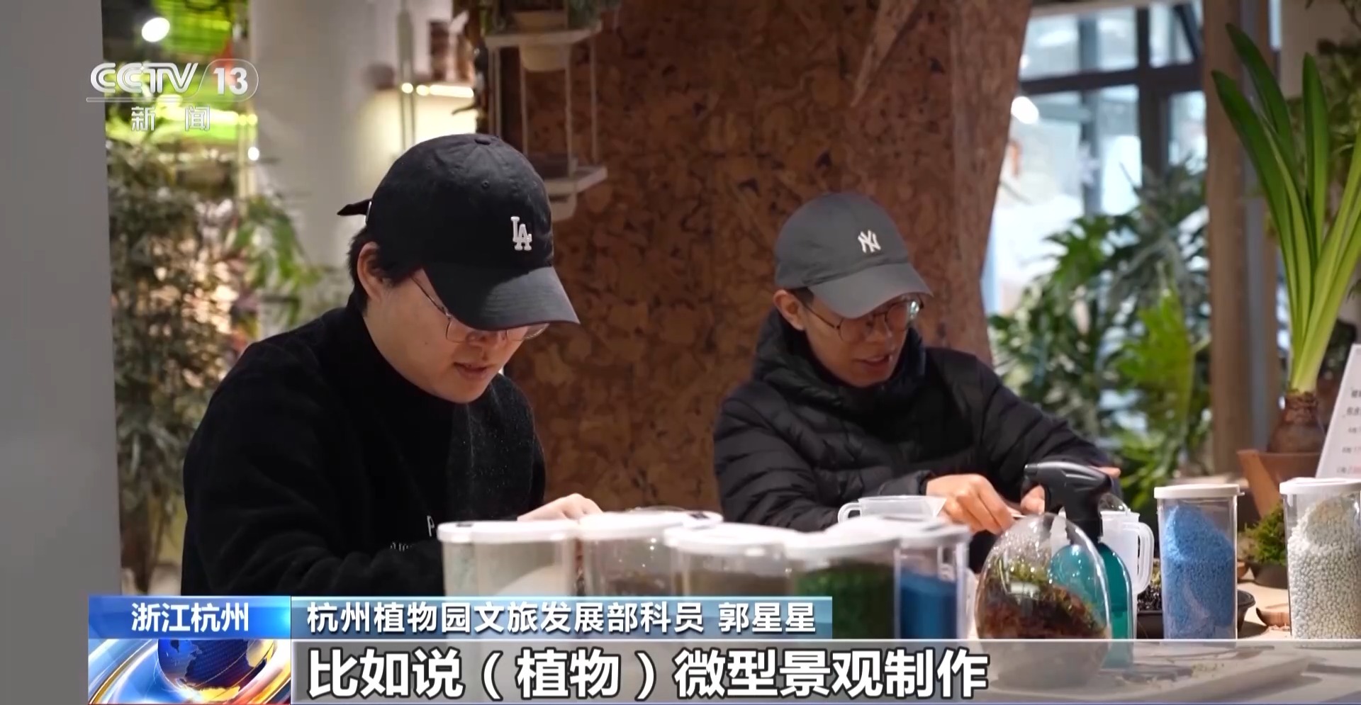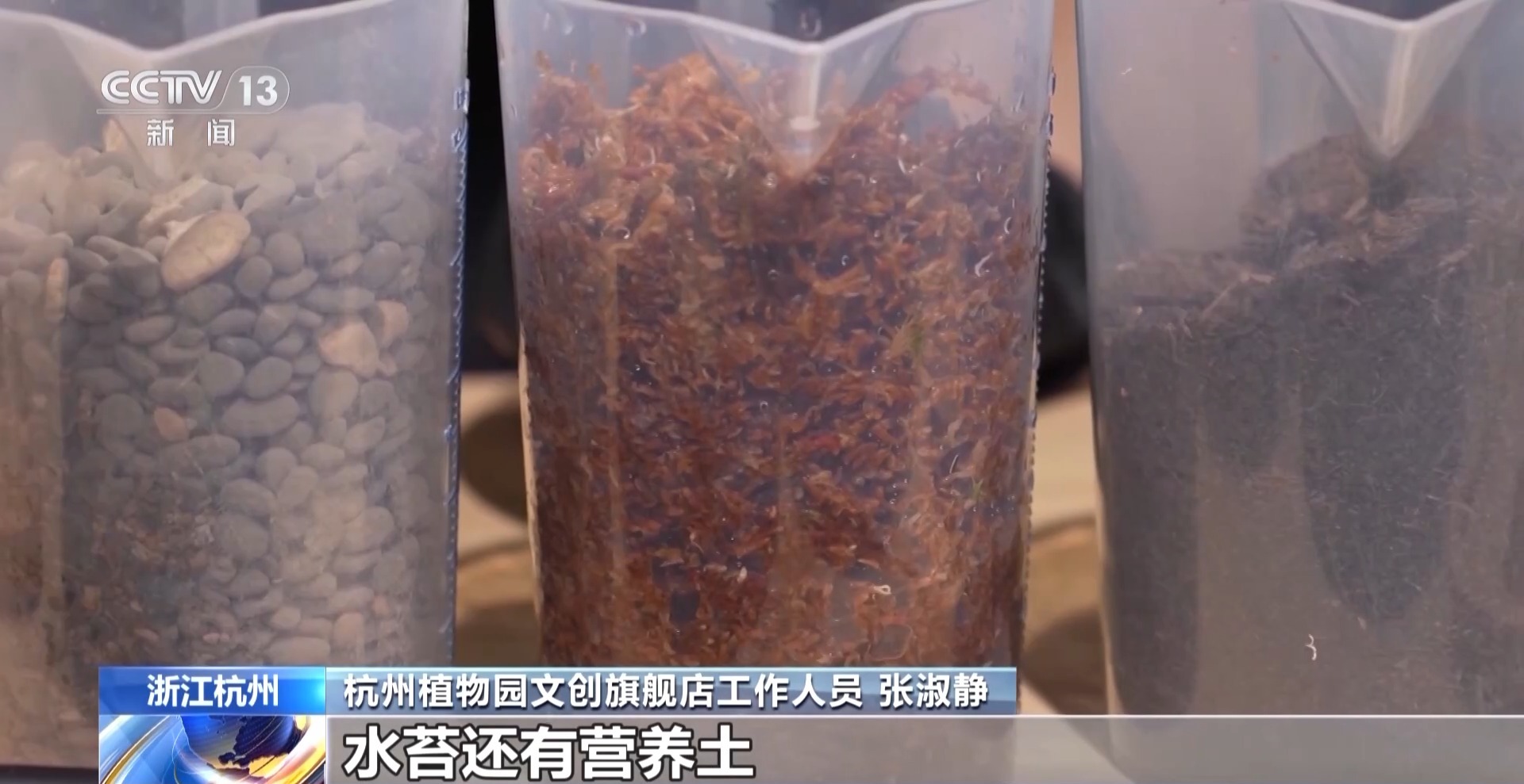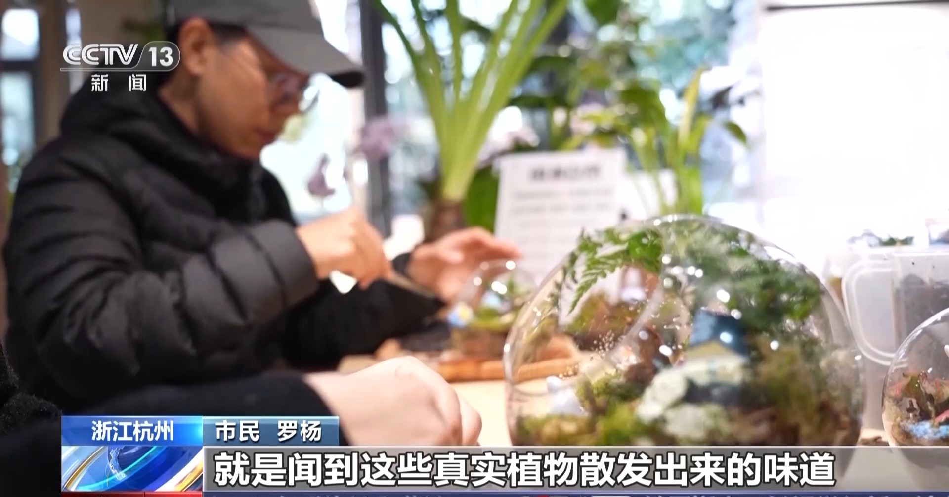 杭州植物園文創旗艦店工作人員 張淑靜:像這樣一個植物微景觀,我們會需要依次鋪上碎石、水苔還有營養土,然後選擇自己喜歡的植物進行搭配。