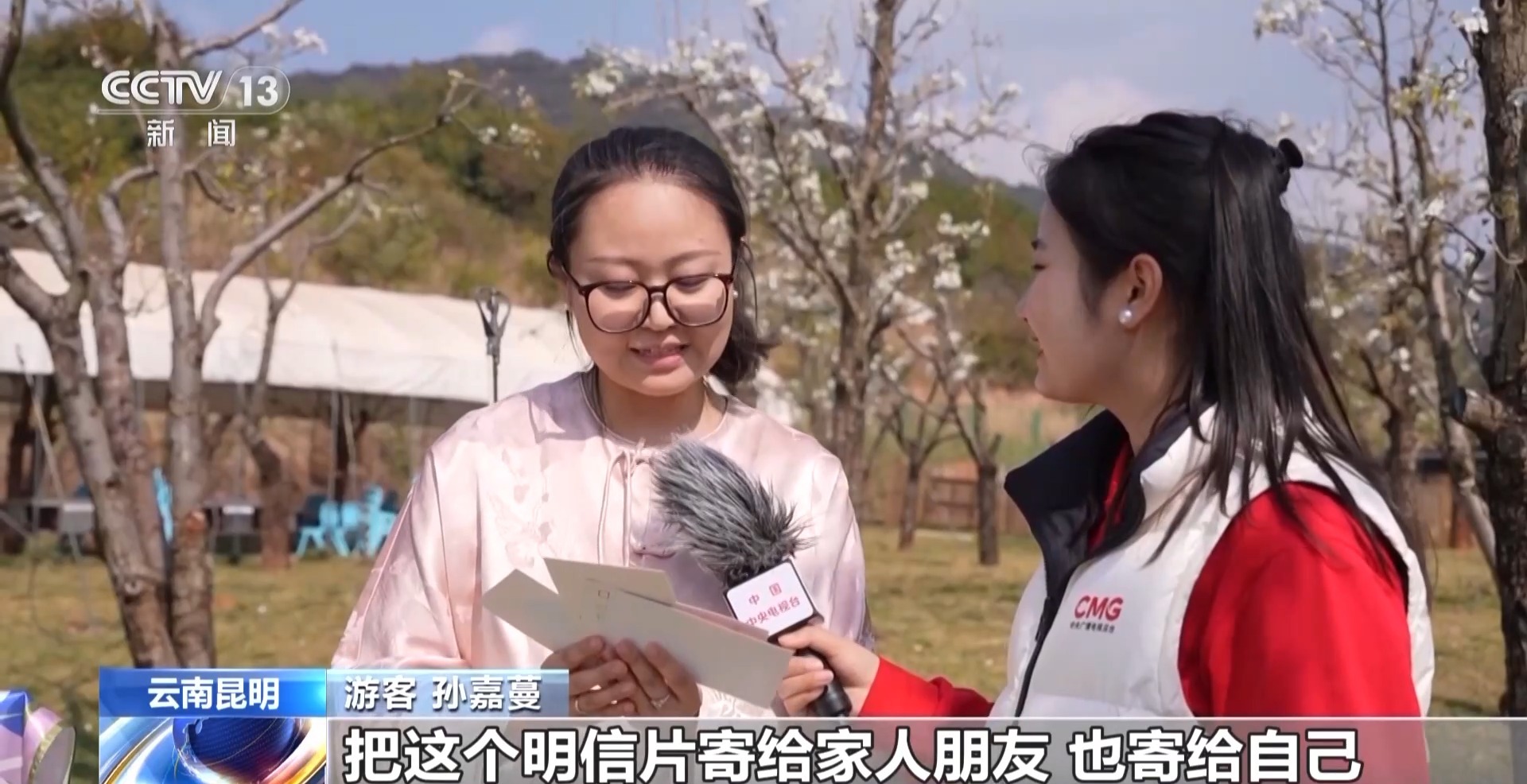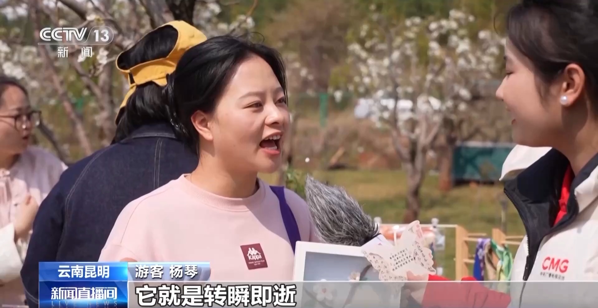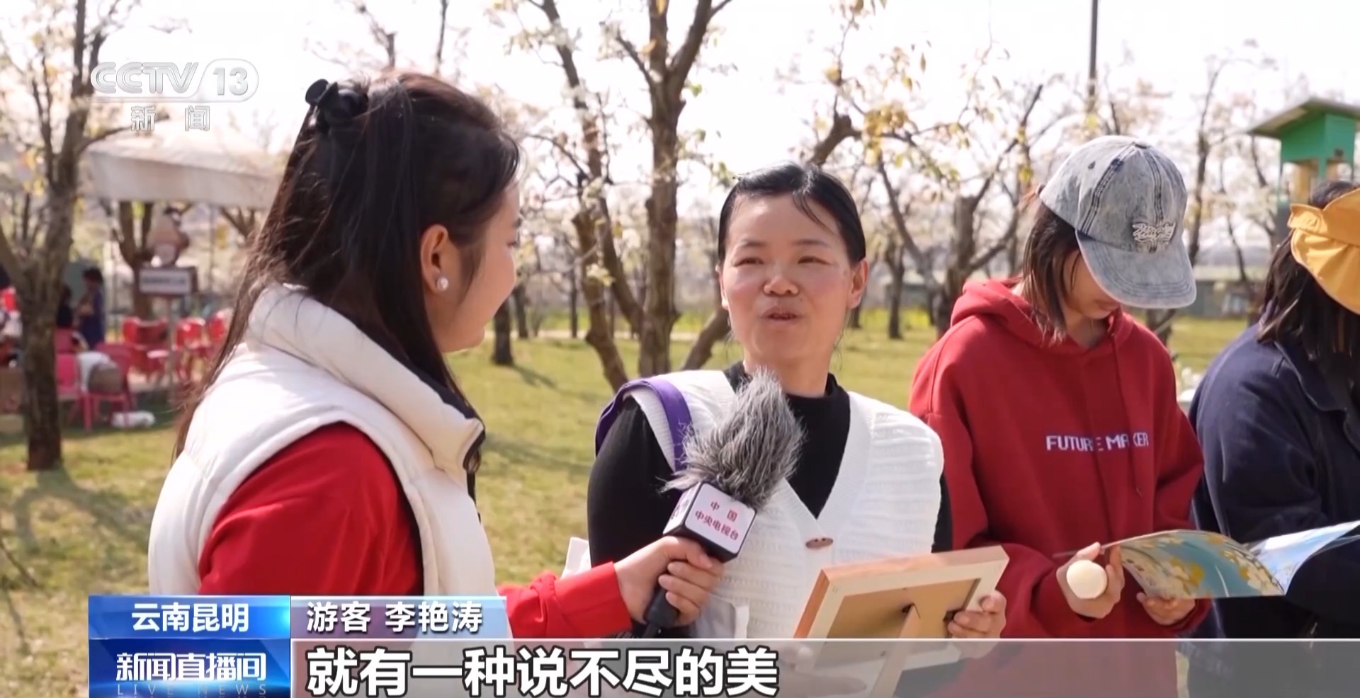 遊客 李艷濤:這里的天和這個梨花輝映起來,就有一種說不盡的美,花瓣特別透脆,而且花蕊很絲滑,讓我覺得沁人心脾,特別棒。