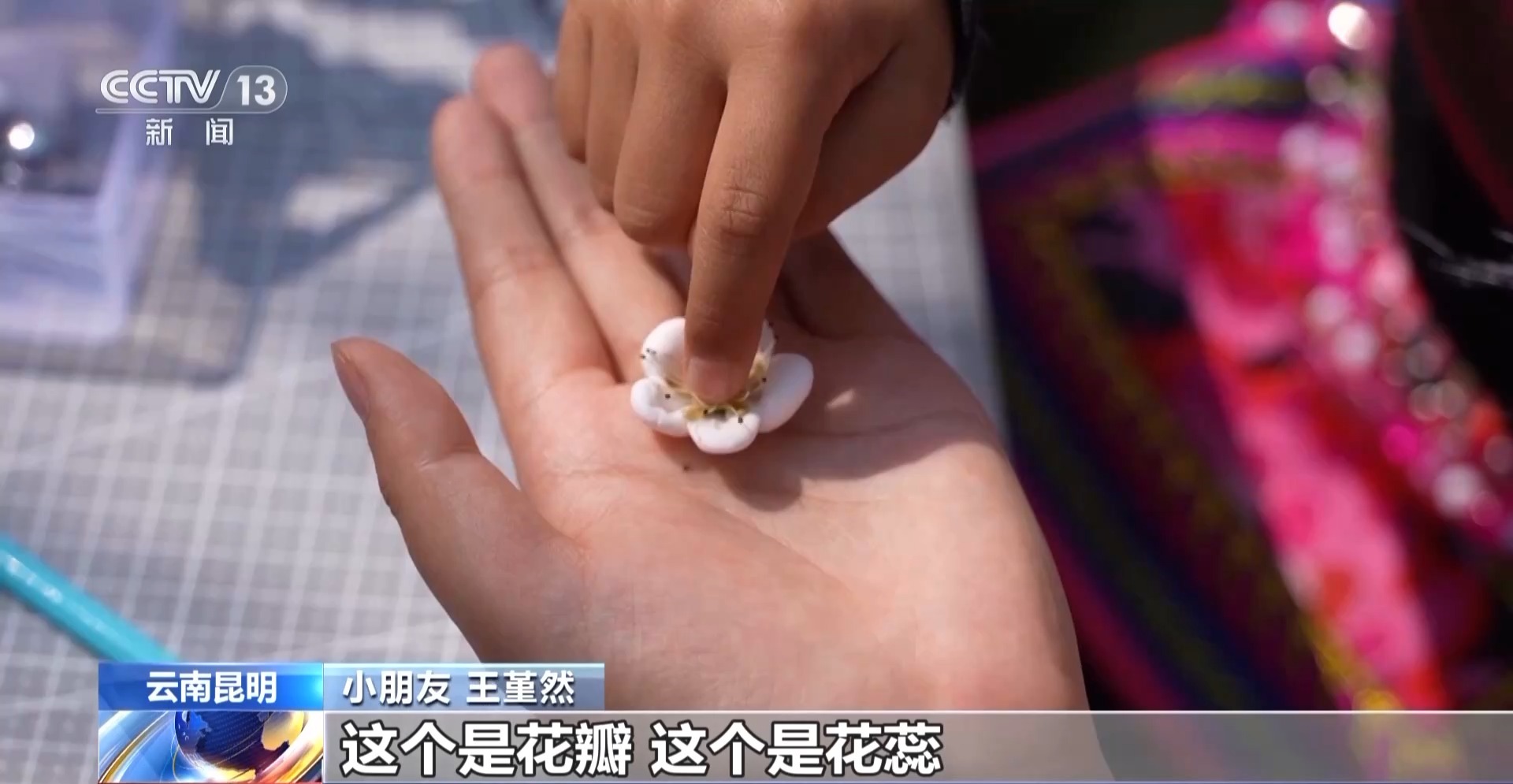 小朋友 王堇然:這個是花瓣,這個是花蕊,用彩泥來做花瓣,用真實的花來做花蕊,可以放很長的時間,能裝飾我們的校園。